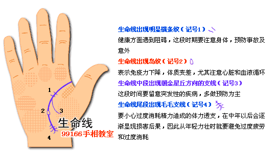 生命线是食指与拇指之间,以半圆形围住拇指球的线.生命线表明生命力的强弱. 假如生命线粗而长并且延伸到手腕表明很抱负;假如线条细但不乱,弧形明晰,大部分正常人均如此;不过即便生命线短,也并不代表短寿,还需要结合参阅其它掌纹.并且后天的保养与摄生才是真实决定因素,假如能在饮食\运动等方面多下功夫,长命也并不难! 而调查生命线的起点,也能够了解一个人是活跃或消沉.