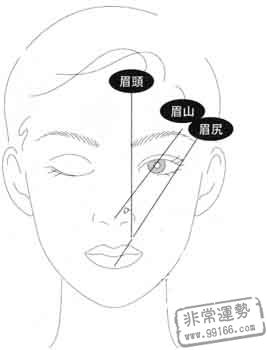 三 阴历三月看右天仓(右眉尾上方)驿马(天仓上方),福堂(眉头之上),右眉尾。宜黄明润泽,忌枯白暗黑,右眉下眼皮处若红黄色则工作运好,而天仓多为黄色好若带赤色更为荣昌,若此处呈白色则家中老一辈逝世,若呈枯黄色败财,行为也不正常。