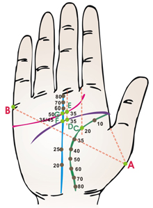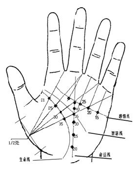 命运线:从手腕为1岁开端,到中指根部年纪逐步递加。命运线与才智线交点为35岁,与爱情线交点为50岁,这两点中心为40岁,其他按这几年的距离分。
