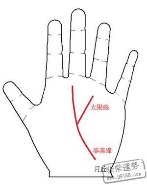 此种手相的你有个特征,人生中常遇贵人帮忙,假如再见到太阳线从工作线伸展到无名指下,男性筑梦结壮,将可名利双收,女人则有很大时机嫁到有成果的先生,是可凭己力或凭先生坐宾士吃鱼翅的类型。
