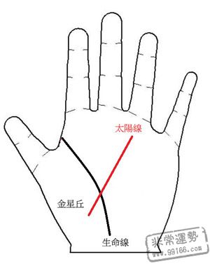 你手上太阳线起于金星丘?有极少量的朋友,太阳线起于金星丘,然后穿越生命线、工作线、爱情线叁大主线,停在无名指下,它意谓着费尽心思、痴心寻求身分位置悬殊的目标,歷经重重困难却不煺缩,总算取得对方接收,而鱼跃龙门。