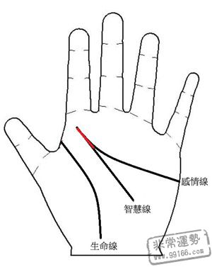 你的才智线起点与生命线分隔,并与爱情线连接而出?有这手相的你,思维生动自在,见地超乎寻常,洞澈人情世故,长于捉摸人道的缺点以达自己的野心,选择目标十分实际考量,且有才能得到对方喜爱,得配贵夫贵妻。
