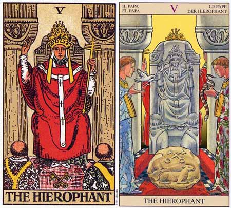 这是一张有关宗教崇奉或传统的牌。皇帝负有供给物质条件的职责,而教皇的职责则是供给心灵上的方向和引导。在组织化的宗教或教堂中,教皇为一般人展现了解他们心灵需求的办法,而这种办法并不需支付多大的尽力,或抛弃太多的自我。教堂供给一个向心灵挨近的路途,让那些没有求道之心的一般人,不致成为迷路的羔羊。