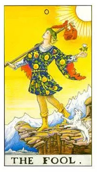 牌面B显现一位穿戴色彩斑斓衣服的男人,头上戴顶标志着成功的桂冠,无视前方的山崖,挺胸阔步的向前走去,身边的小白狗在狂吠,似乎在提示他前面的风险,又似乎在跟他相同义无返顾的向前冲去,面临峻峭的山崖也临危不惧。