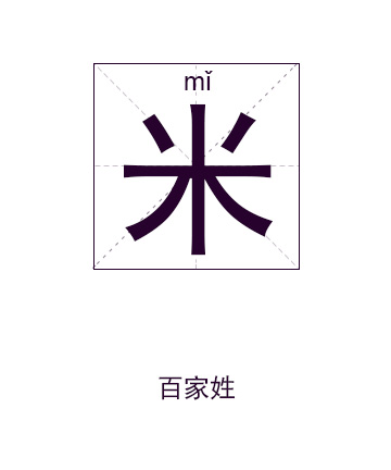 米字的主五行为“水”,因而,米姓人姓名中的榜首个字一般来说忌用“土”、“火”五行的字。