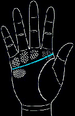 起点与生命线在同一方位,横切过手掌,执着心强,毅力坚决,特性过于好强,有时会有孤立的倾向。