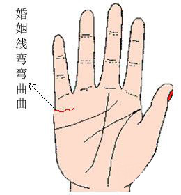婚姻线弯弯曲曲成锁链状,表明男方会金屋藏娇,寻欢作乐;女方则会红杏出墙,声东击西;并且易染性病。